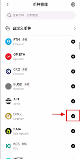 在币种这里,点击这个图表,在列表中找到狗狗币,点加号添加,在返回的界面,划到最底部,点击狗狗币,就可以看到我的地址。可以把它复制出来,稍后我们需要用到。