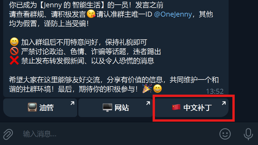 点击以下链接,加入我的电报群,点击“中文补丁”即可一键设置。